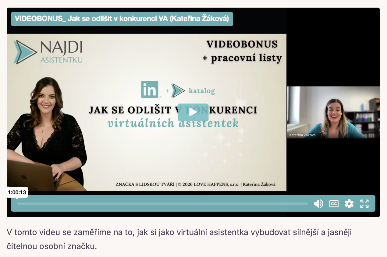✔ Video bonus + pracovní PDF na téma: Jak se odlišit v konkurenci VA Zkratka virtuální asistentky / virtuální asistence. a mluvit o své práci srozumitelně a lidsky