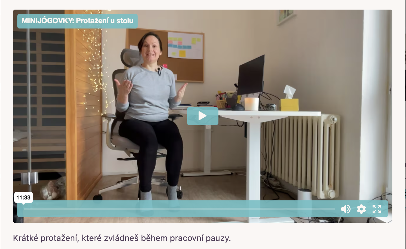 5x jógovka na každý pracovní den, která vás jemně provede přetížením, ukáže, jak se protáhnout u stolu, na podložce, či ve stoje a zklidní vás prostřednictvím dechového cvičení.
